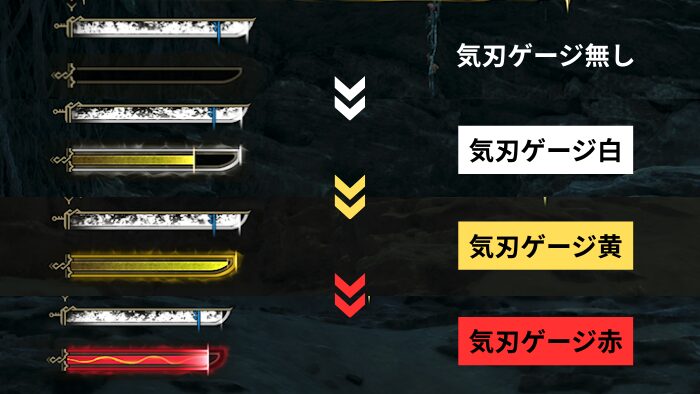 色段階が上昇する毎に攻撃力が上がり、最終段階である赤ゲージを維持することで、太刀の本領を発揮できます。