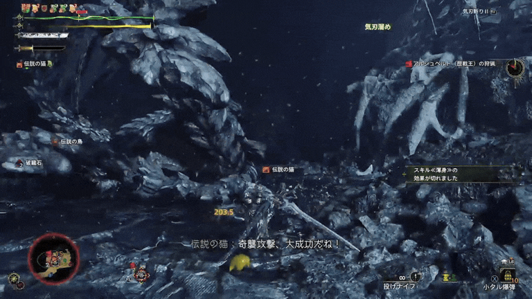 | 【アクション】 | 【奇襲攻撃】→【気刃溜め】→【気刃大回転斬り】→【特殊納刀】→【居合抜刀気刃斬り】 |
